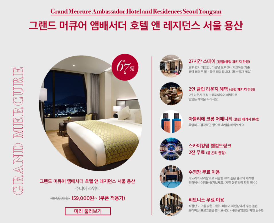 · 그랜드 머큐어 앰배서더 용산 6만원 할인코드 / 노보텔 앰배서더 용산 4만원 할인코드 (~09.19)