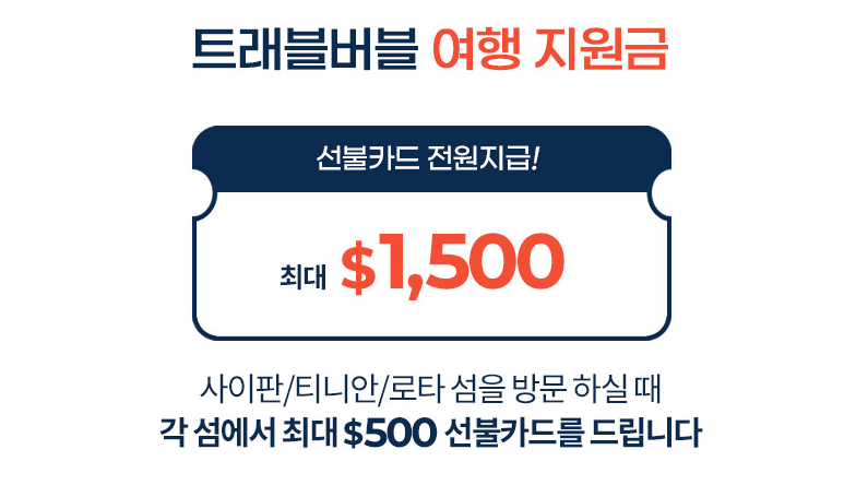 · 8박이상 체류시 1인당 $1,500 지원: 사이판/ 티니안/로타 방문시 섬당 각 $500 선불카드 지급