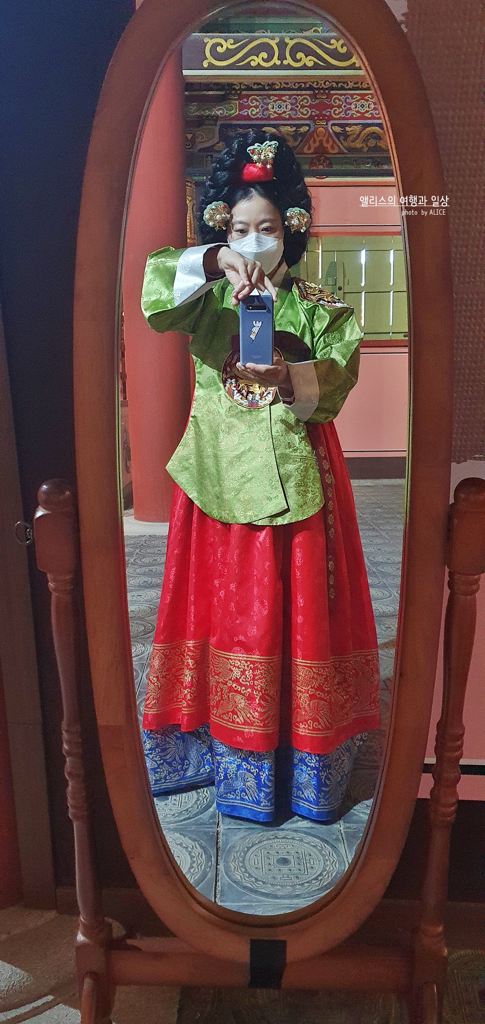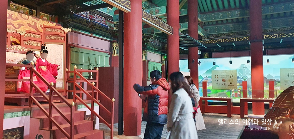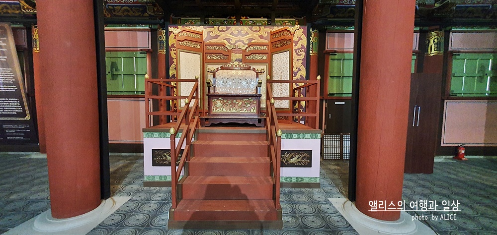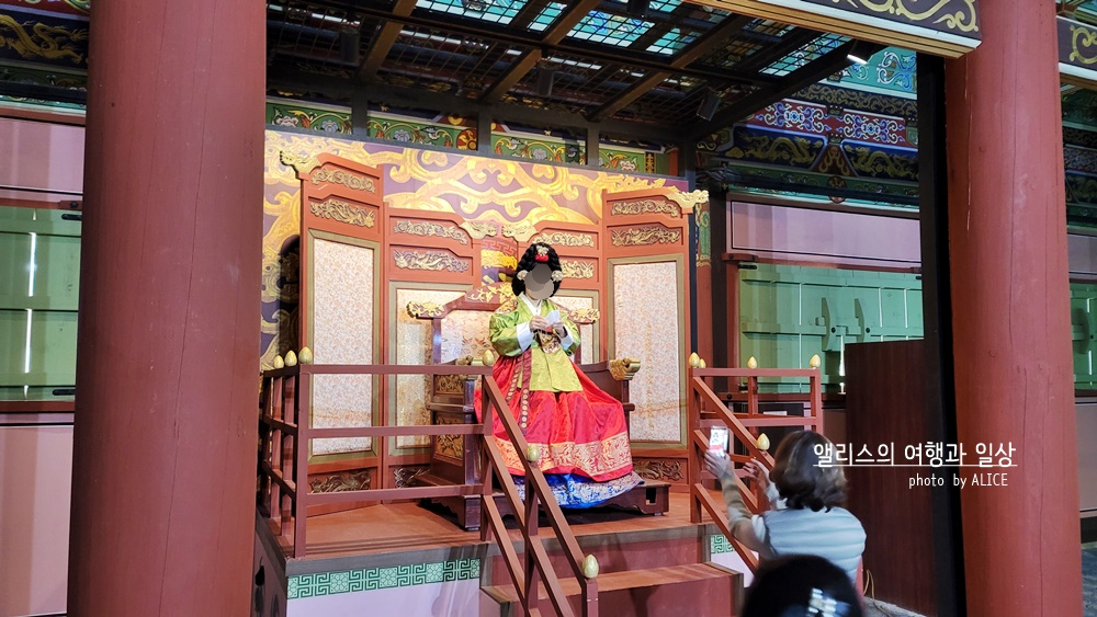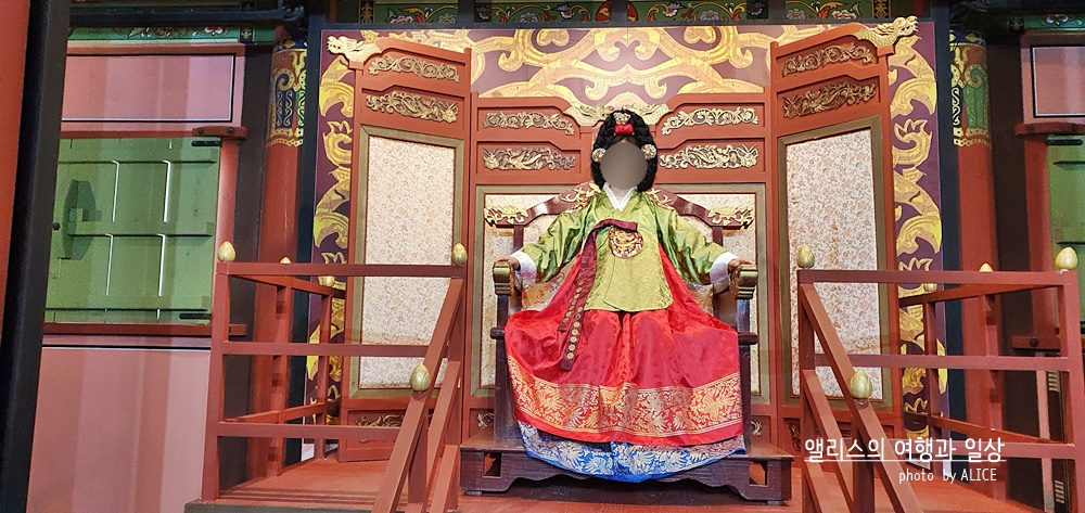 나도 2천원 현장결제하고 어좌체험을 했다. 옷을 입고 가채까지 얹어쓰니 내 모습이 거울로 봤을 때 제법 그럴 듯 해보였다. 사진은 이 곳을 운영하는 직원분이 찍어주셨다. 다만..!!!! 본의아니게 어좌는 높이가 높고, 사진을 찍어주시는 분은 아래에 계시니 사진이 굉장히 부~~해 보일 수 있다는 것. 턱살 다 드러나니 숨길 수가 없다는 것!!! ^^;;;;
