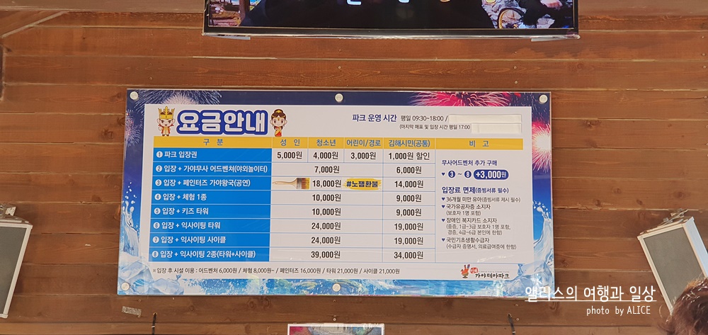 현장에서 구매하면 딱히 할인을 받을 수 있는 여지가 없는데, 김해가야테마파크 공식 홈페이지에서 온라인으로 예약하면 최대 15%까지 할인예약이 가능하니 참고하자. ▶ 온라인 예약 자세히 보기