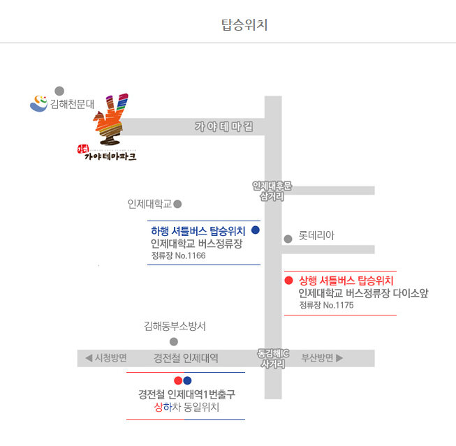 · 무료셔틀 탑승장소: 인제대 정류장 정문(하행), 경전철 인제대역 (1번출구), 인제대 정류장 다이소 앞(상행)
