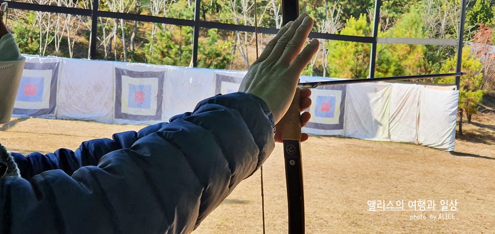 활이라는 것을 생전 처음 잡아본 나로서는 내가 제대로 활을 쏠 수 있기나 할까라는 걱정이 먼저 들었다. 하지만 이내 쉽게 자리를 잡고 활을 쏘고 칭찬을 받을 수 있었던 데에는 이곳을 관리하는 선생님의 꼼꼼한 설명이 한 몫 단단히 했다. 양궁과 국궁의 자세차이부터 활 시위대를 잡는 방법, 그리고 그에 따른 손의 위치와 모양등을 꼼꼼하게 지도받았다. 시간이 오래 걸린 것도 아니었다. 생각보다 안내/교육 시간은 빨리 지나갔고 금새 나는 자리를 잡고 활을 쏠 수 있었다.