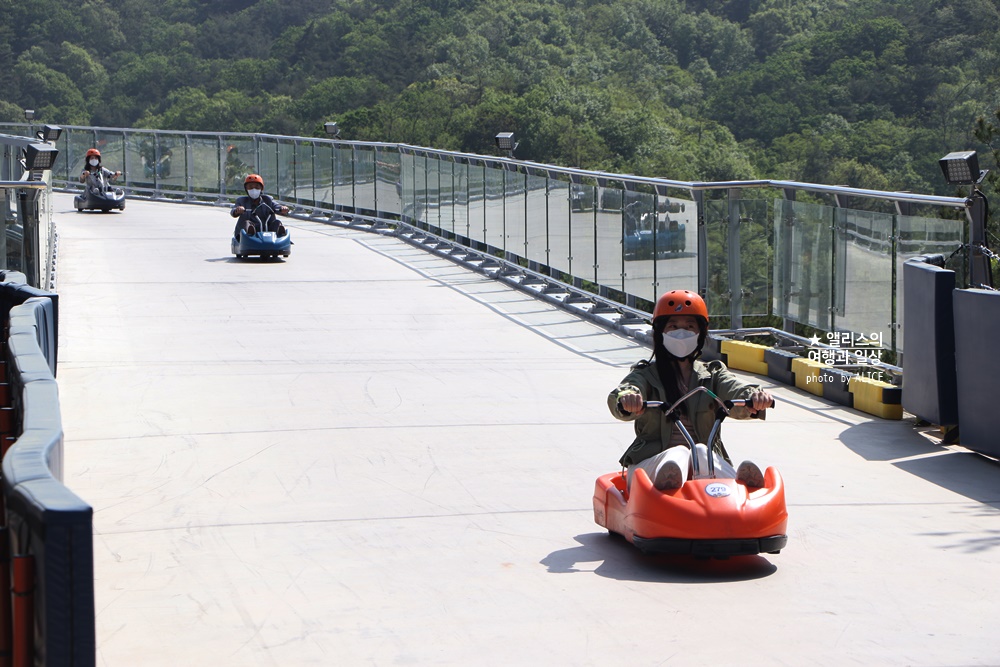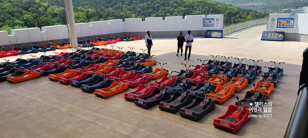 나는 천마 코스를 선택했는데 천마코스를 직접 이용해보니 화랑 코스에 비하면 확실히 스릴감이 달랐다. 경사도 상당한 편이었고 그래서 속도를 얼마든지 낼 수 있었다. 물론 안전 탑승을 생각한다면 경사가 심한 구간에서는 브레이크를 어느 정도 활용하면서 이동해야 한다. 안 그러면 속도가 진짜 정말 빨라진다.