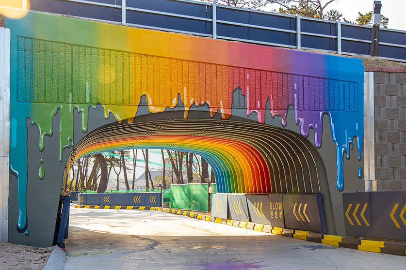 각 코스마다 요렇게 독특한 그림이 있었다. 착시현상이라는 것을 잘 알지만 일순간 그 착시 공간을 지나간다는 것도 재미있었고, 다양한 컬러의 동굴을 지나가는 것도 흥미로웠다. 루지라는 것이 무동력 장치로 이동하는 재미가 있지만 주변 풍경이 좋다면 더더욱 즐겁다. 각 지역의 루지마다 코스를 만들 때 주변 환경을 잘 활용한다. 어떤 곳은 저 멀리 바다가 보이기도 하고 또 어떤 곳은 멋진 숲과 함께하기도 한다. 경주 루지월드의 경우 이런 착시 현상이 중간중간 있어서 흥미로웠다.