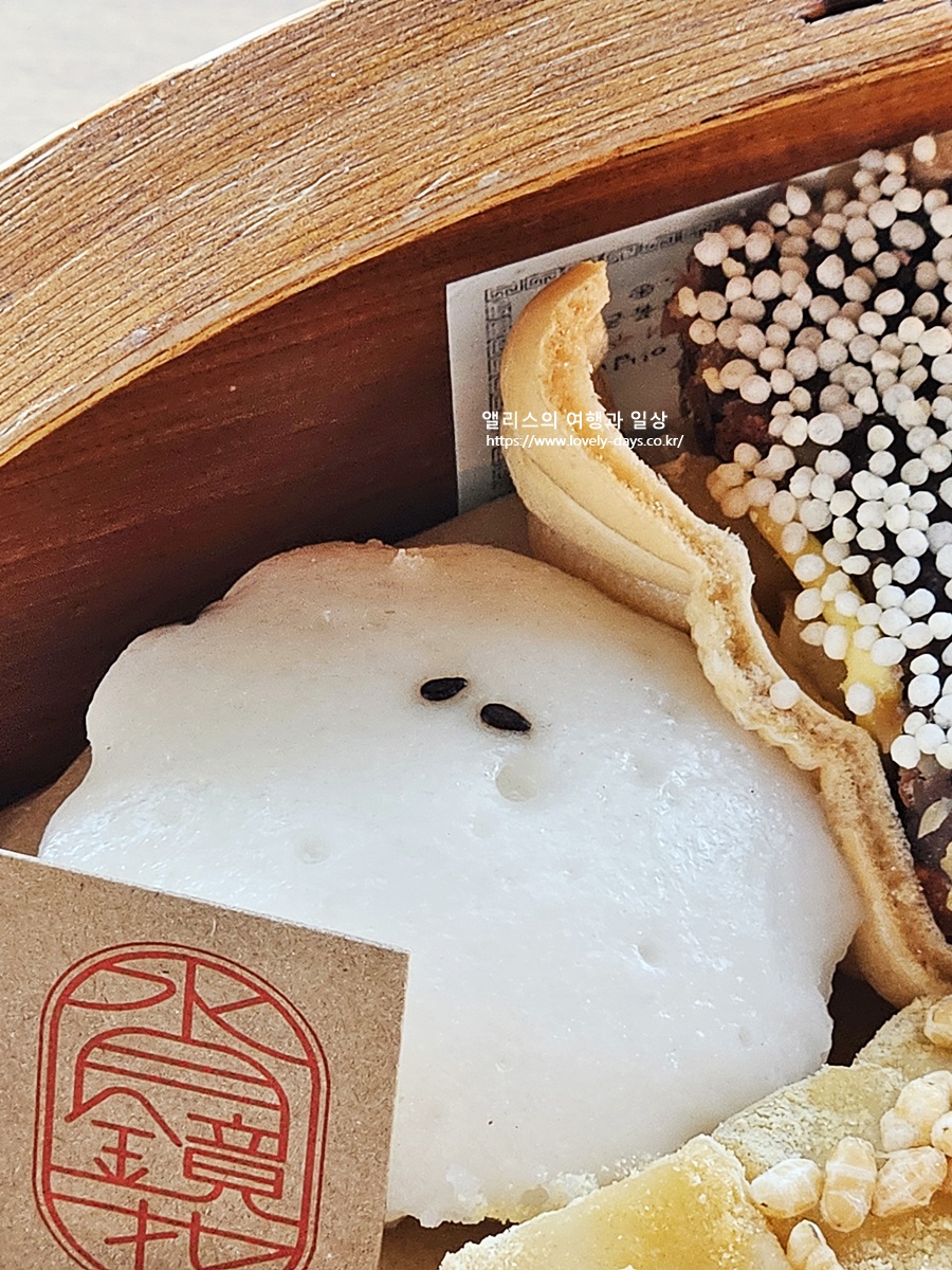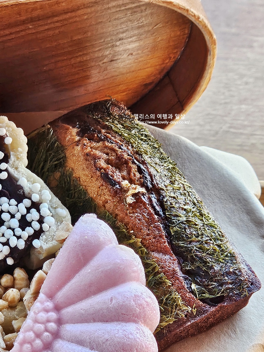 흑미 술빵, 인절미 꼬챙이, 이보아르 가나슈 모나카, 앙버터 모나카 등 한국적인 디저트가 예쁜 나무상자에 담겨 나온다.